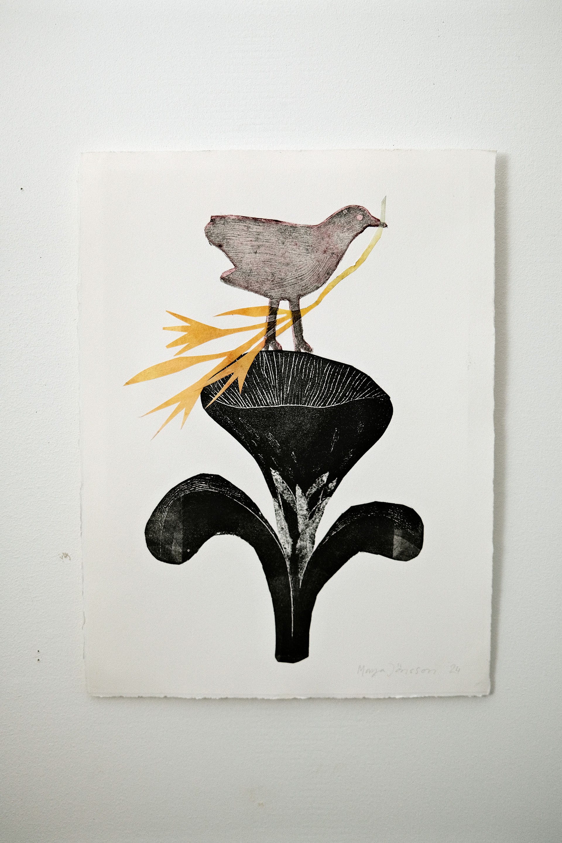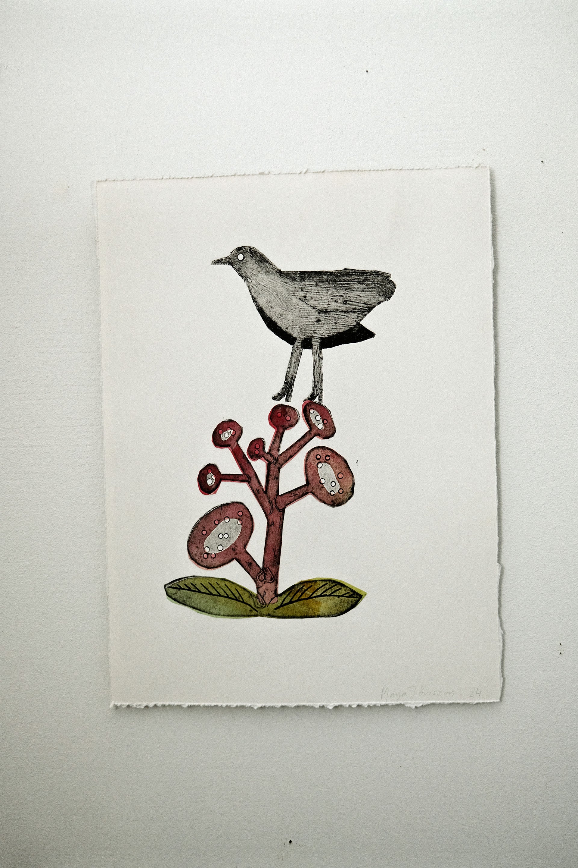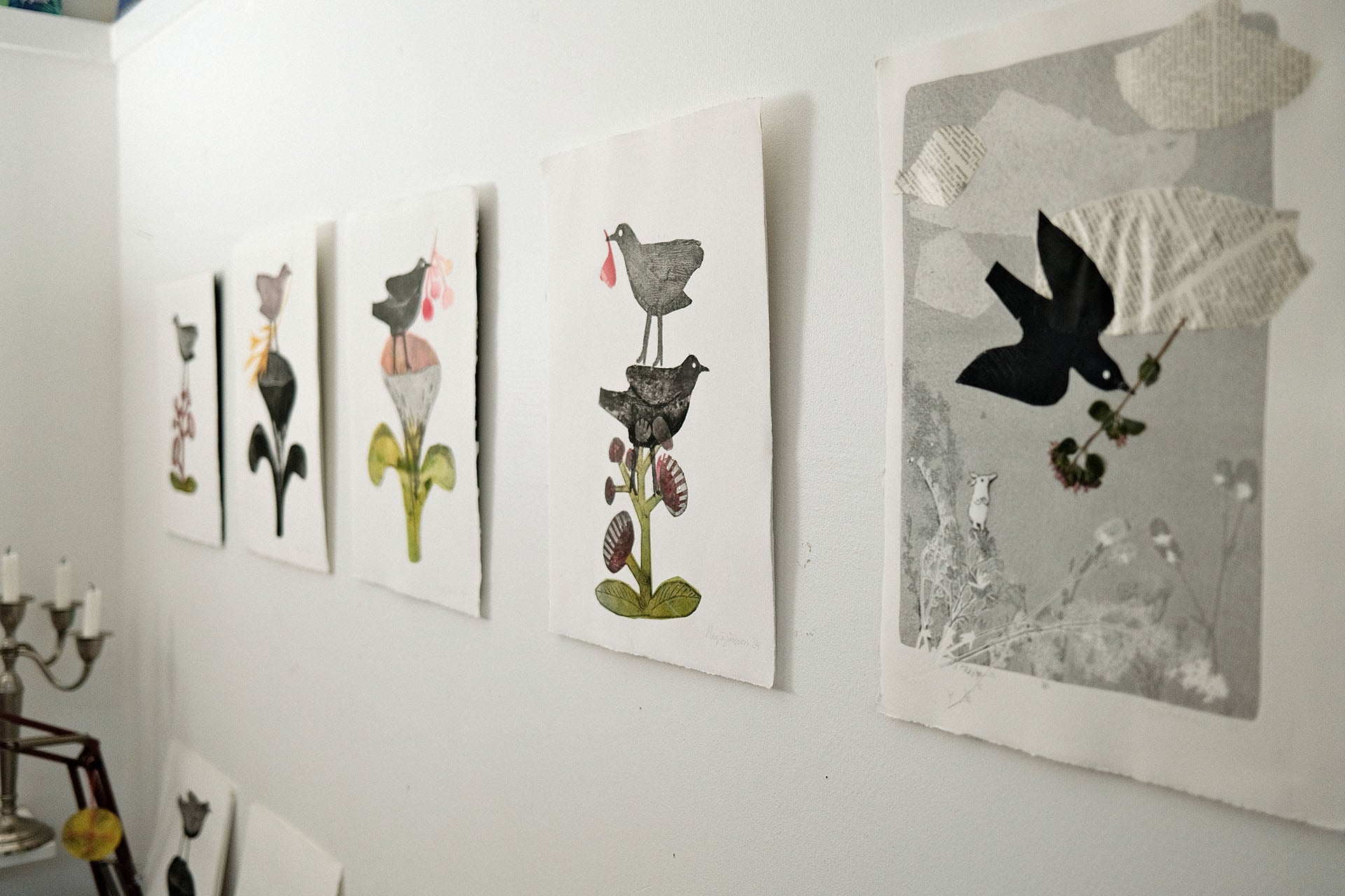 Grafiska blad i teknikerna kolografi och chine-collé. Bladen är monterade på en kartong baksida. Storlek c:a 25x35 cm.
