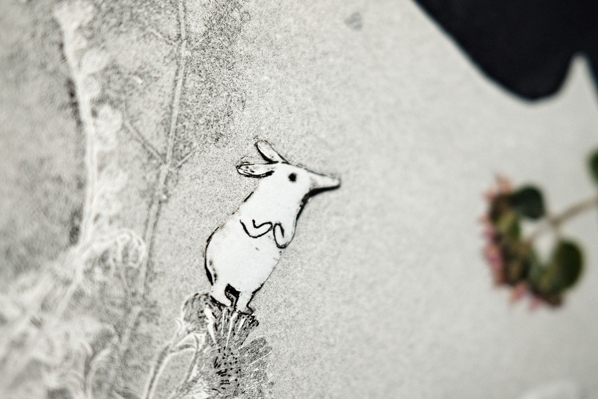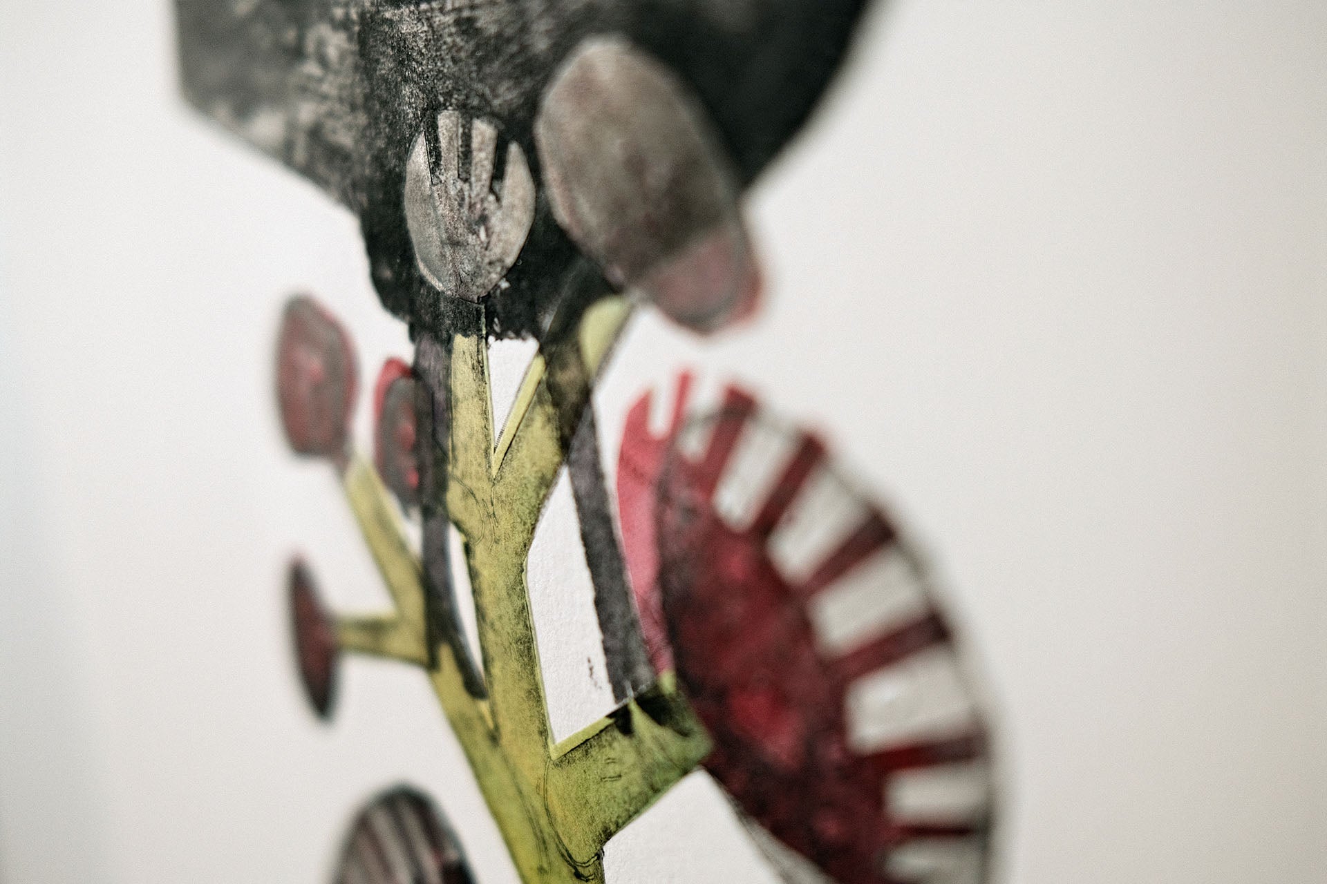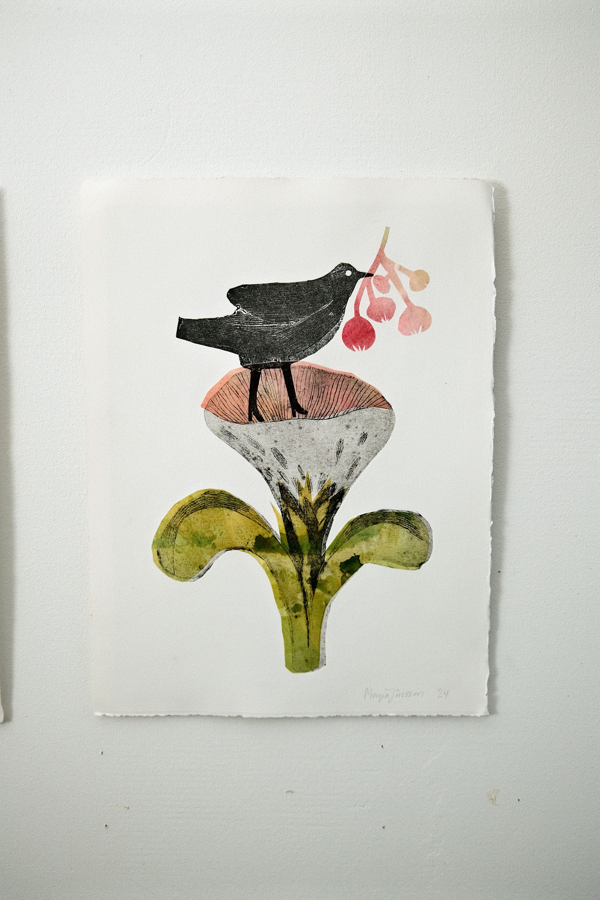 Grafiska blad i teknikerna kolografi och chine-collé. Bladen är monterade på en kartong baksida. Storlek c:a 25x35 cm.